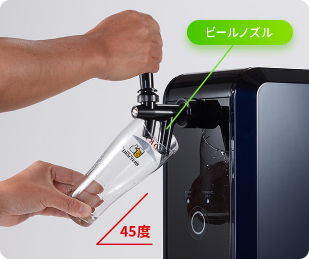 グラスを45度に傾けて、グラスの内側にビールノズルを密着させます。