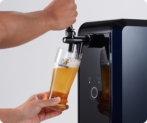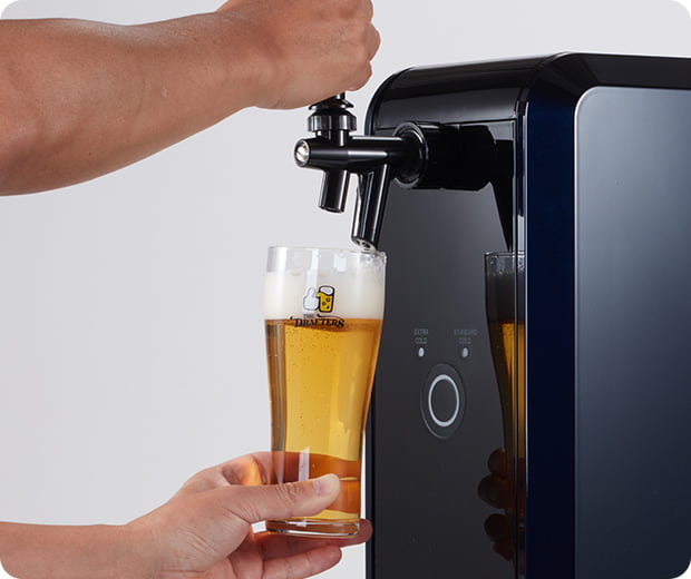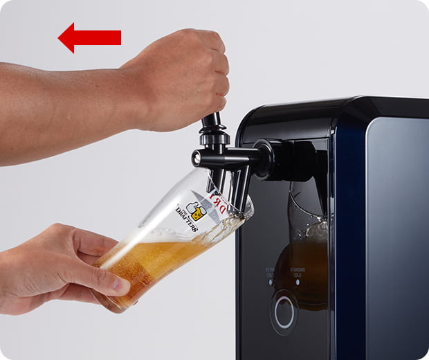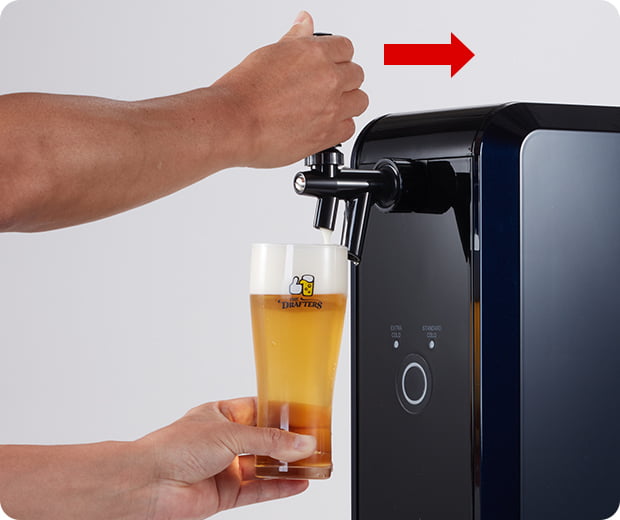 ②レバーを手前に倒し、ビールを注ぐ