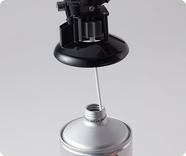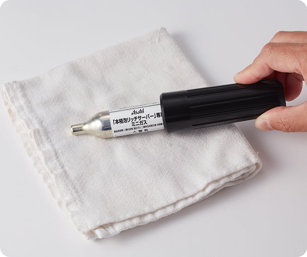 必ずおこなうミニガスを取り出す際、残っているガスが噴射され低温になります。手で直接、ミニガスを触ると凍傷の恐れがありますので、必ず布などの上に置いてしばらくお待ちください。 -
